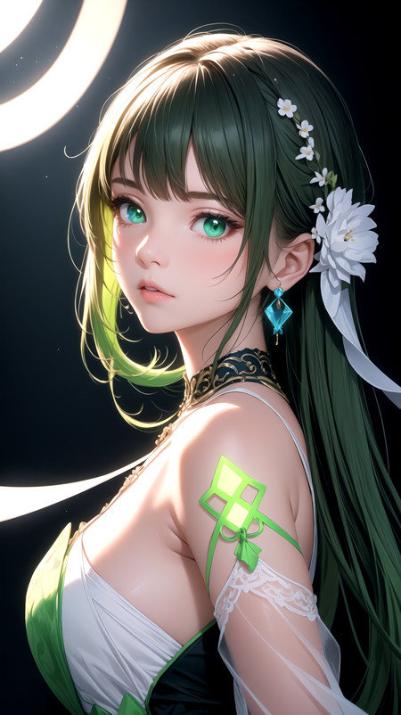 A beautiful girl with off-white long hair, white luminous eyes, green luminous earrings, and a black floral dress with blue and green patterns, masterpiece, studio light, professional, highres, best quality, HDR, shot from the side Light,