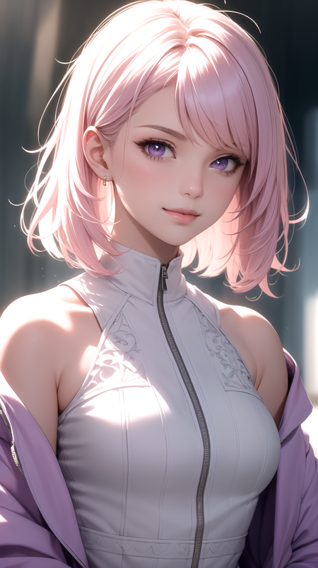 (masterpiece, best quality), intricate details, thin, ((slim)), beautiful girl, Light pink hair, white skin, light purple eyes, sharp jawline, cropped jacket, messy hair, lips, upper body, close up, smirk